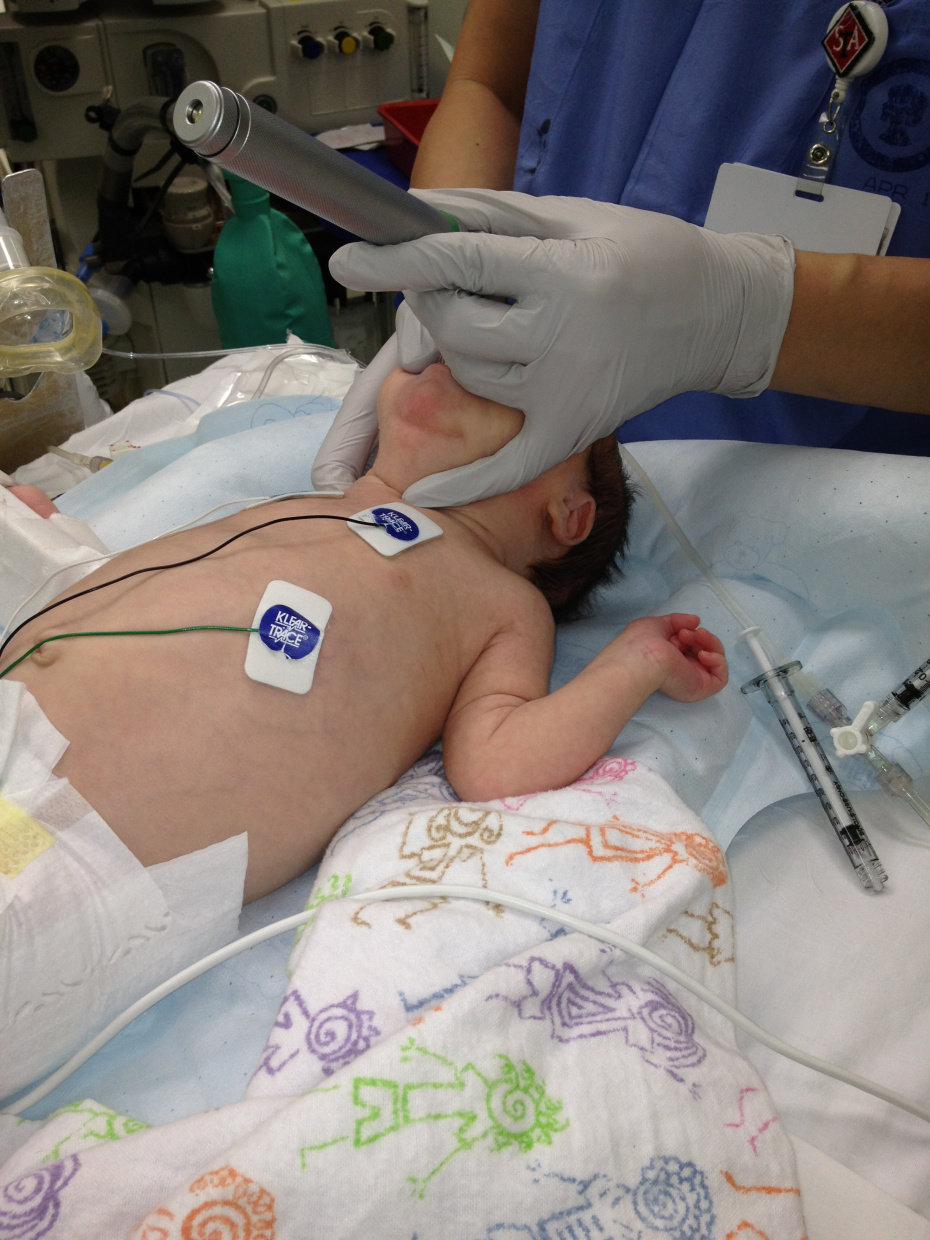 Infant Laryngoscopy – During laryngoscopy of an infant, the 5th finger of the left hand can provide cricoid pressure to improve glottic visualization.