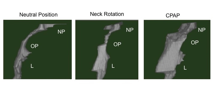 Upper Airway Obstruction During Lateral Neck Rotation – 3D reconstructed MRI images of child with neck in neutral position, lateral rotated, and rotated with 10 cm H2O CPAP. NP=nasopharynx, OP=oropharynx, L=larynx.